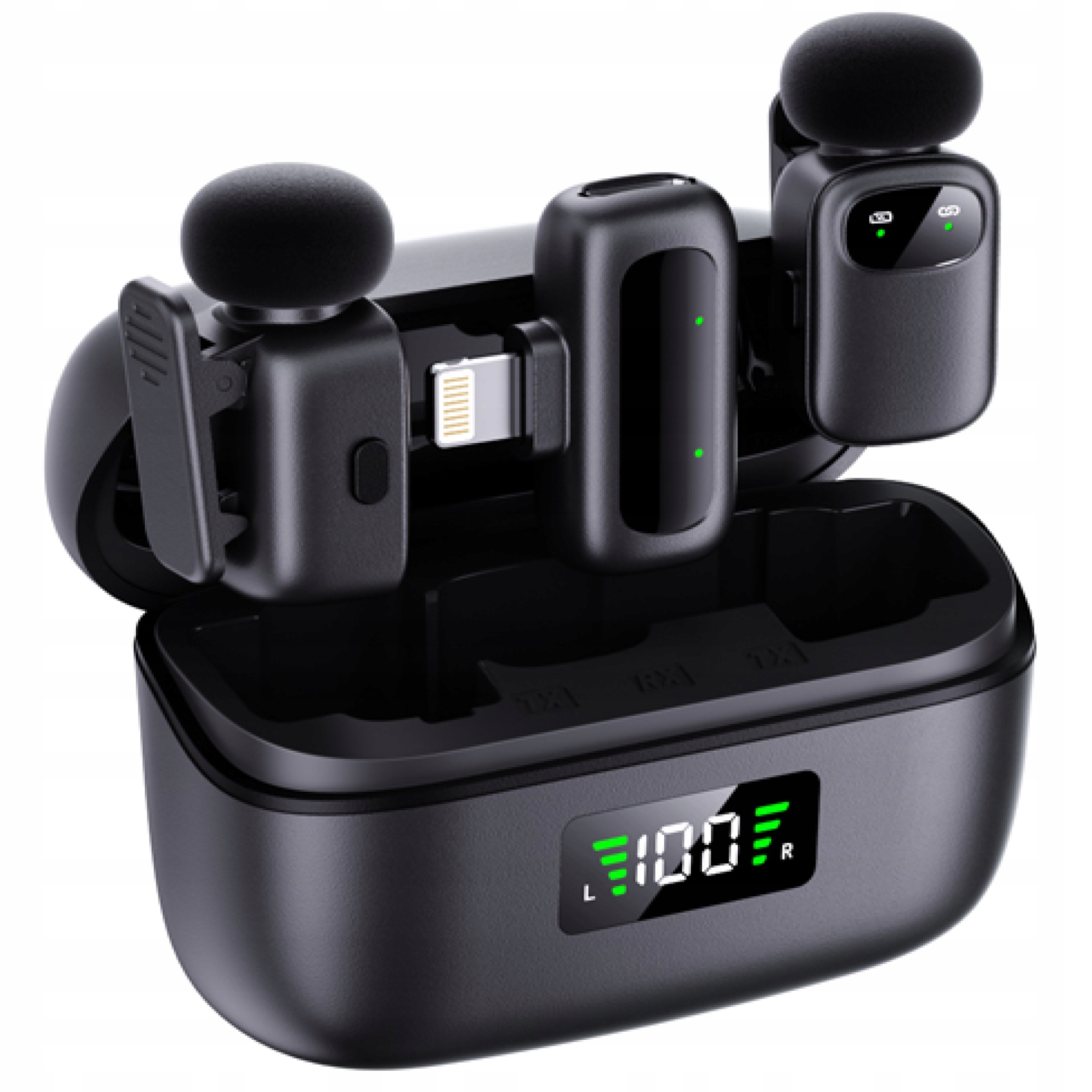 - Etui z wyświetlaczem LED – pokazuje procent naładowania, pełni też rolę powerbanku dla mikrofonów.