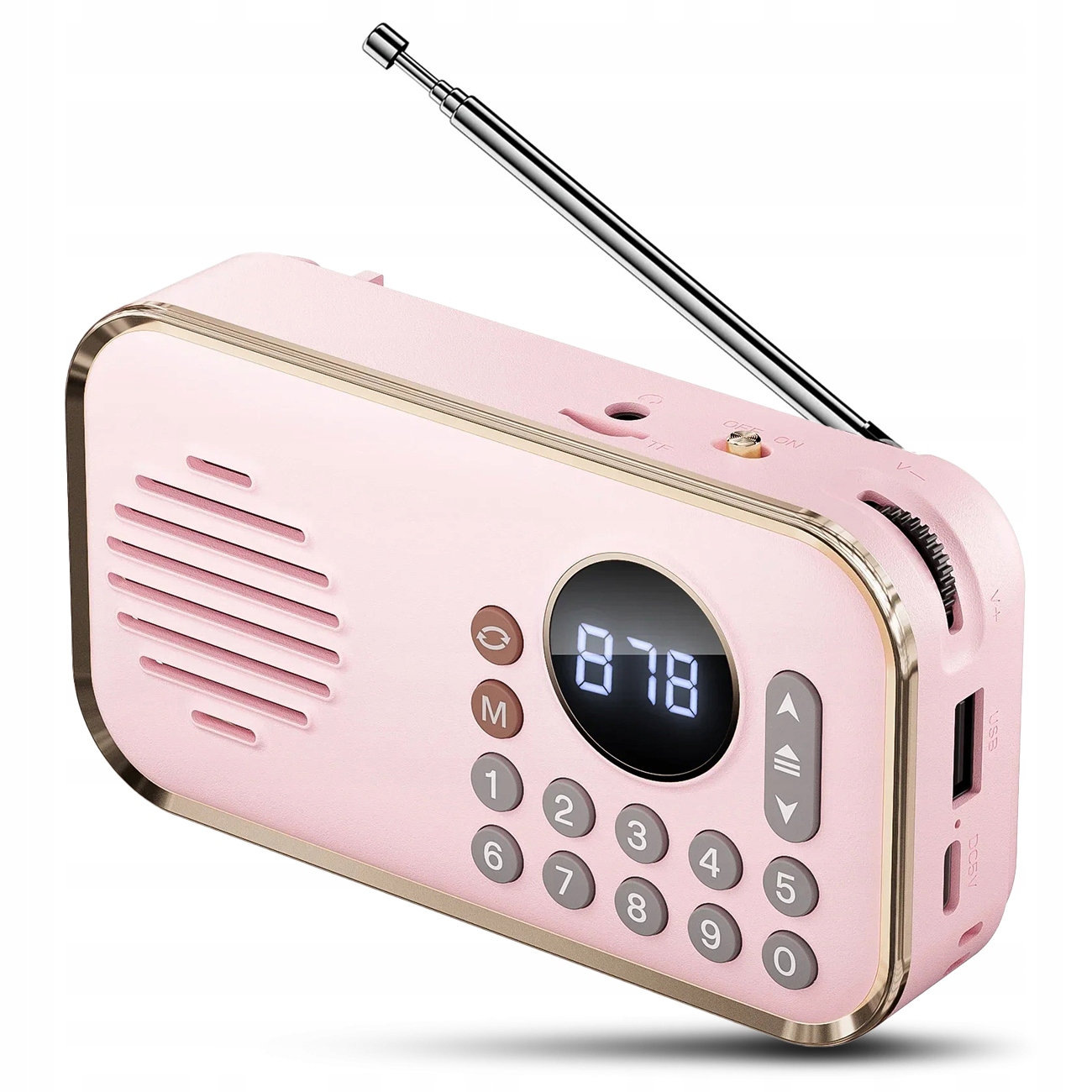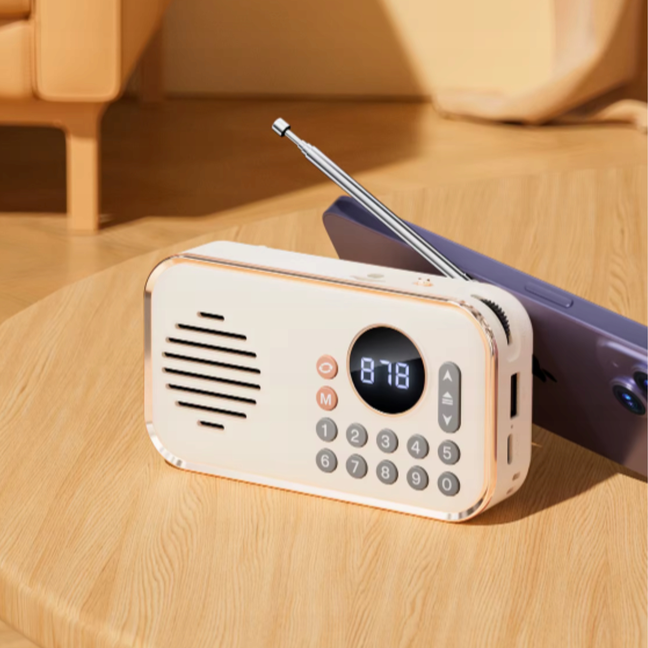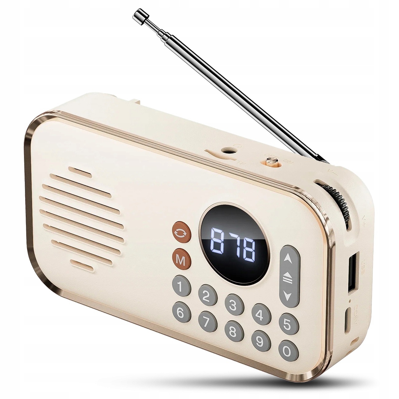 Stylowa obudowa przyciąga wzrok, złote krawędzie, pokrętło do regulacji głośności, przyciski numeryczne do ustawienia częstotliwości stacji dodają mu niepowtarzalnego uroku. Głośnik o mocy 5W zapewnia duży poziom głośności, a wbudowany akumulator 1200 mAh pozwala na nieprzerwaną zabawę muzyką przez kilka godzin. Bluetooth ma zasięg do 20 metrów, więc można słuchać muzyki z większej odległości, bez obaw, że połączenie z głośnikiem zostanie zerwane.