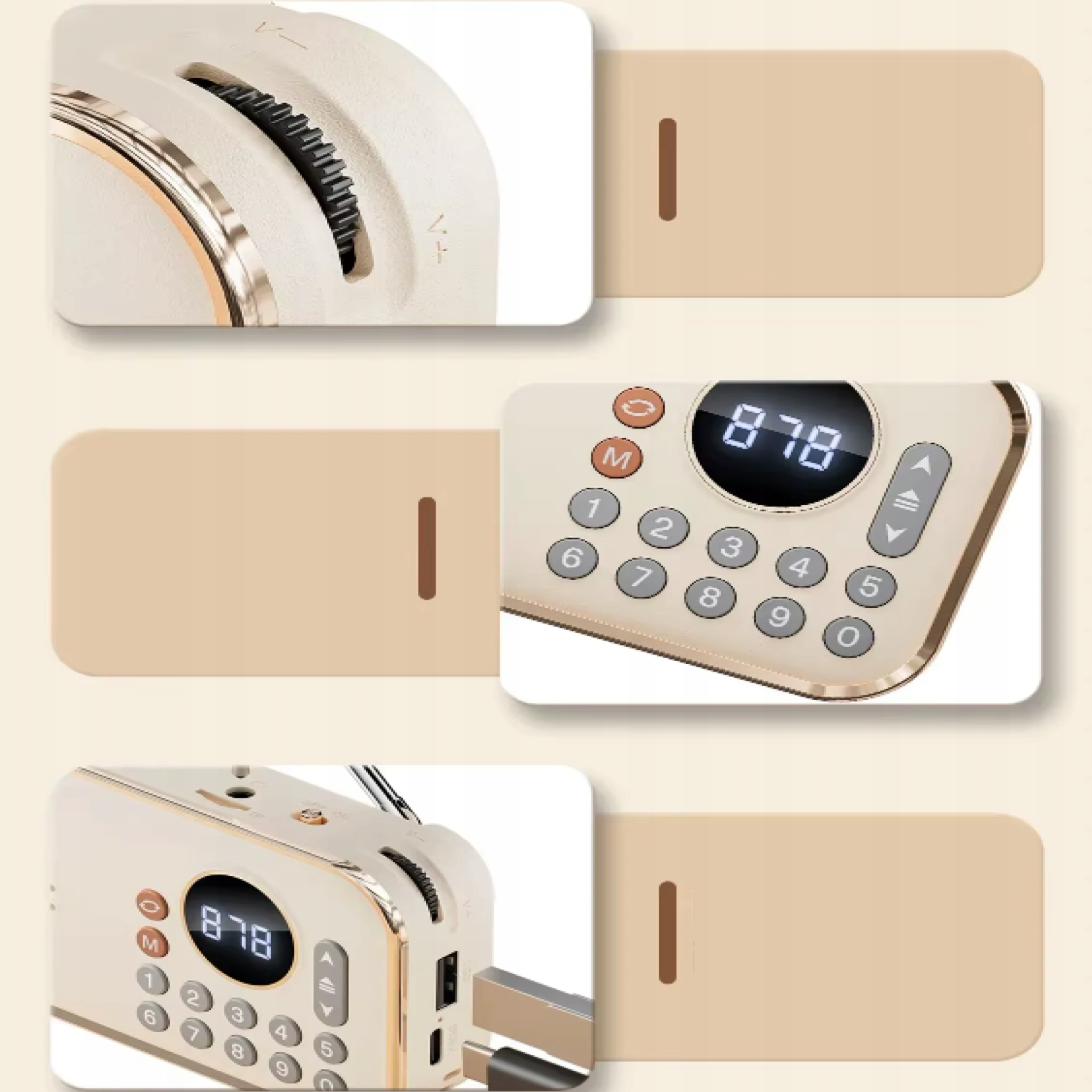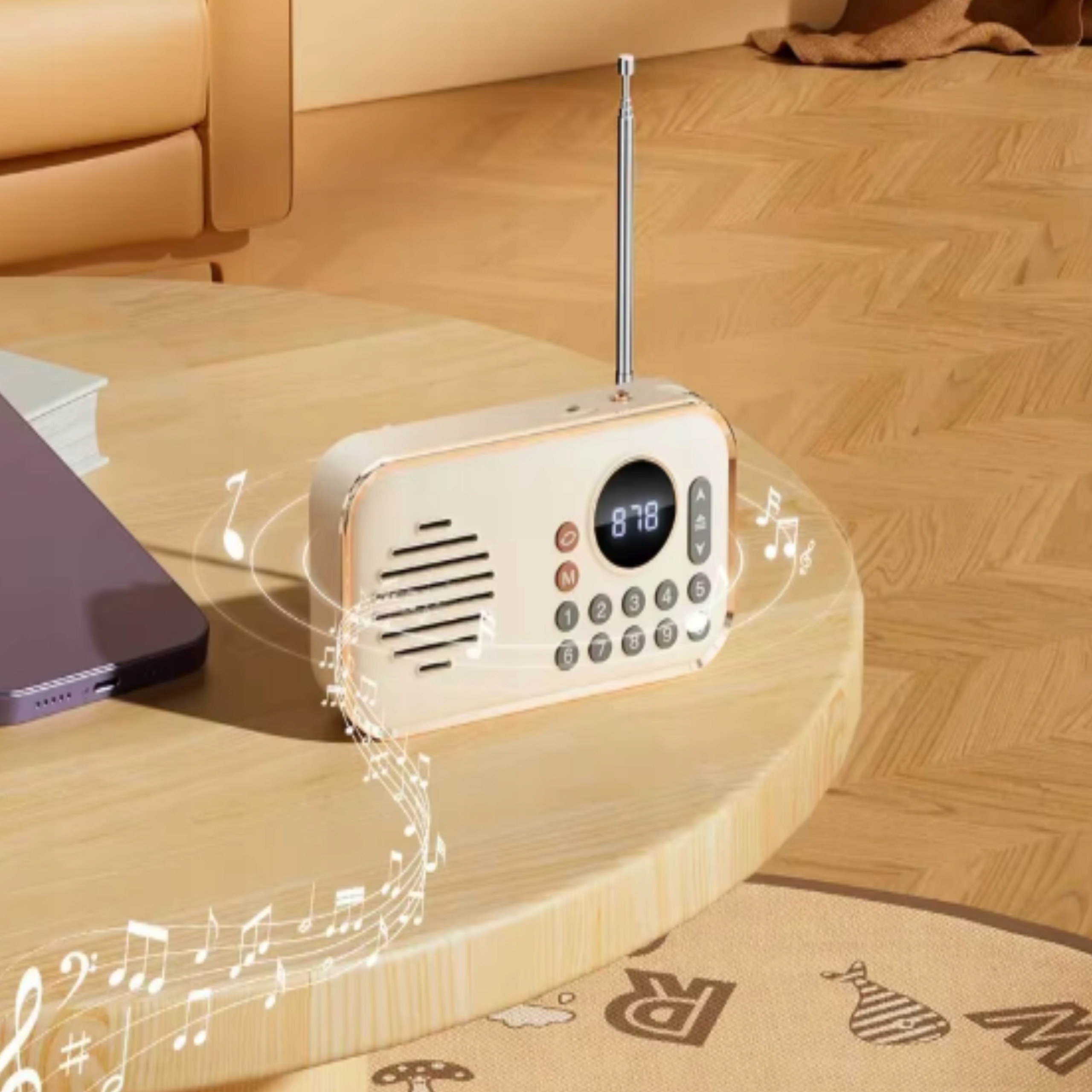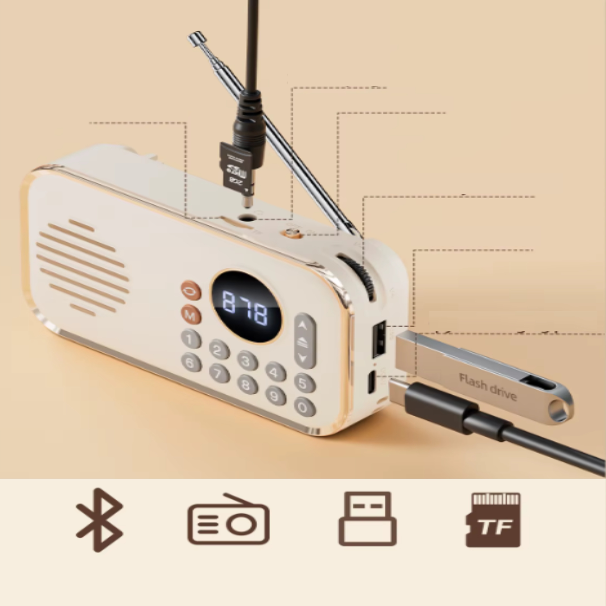Stylowa obudowa przyciąga wzrok, złote krawędzie, pokrętło do regulacji głośności, przyciski numeryczne do ustawienia częstotliwości stacji dodają mu niepowtarzalnego uroku. Głośnik o mocy 5W zapewnia duży poziom głośności, a wbudowany akumulator 1200 mAh pozwala na nieprzerwaną zabawę muzyką przez kilka godzin. Bluetooth ma zasięg do 20 metrów, więc można słuchać muzyki z większej odległości, bez obaw, że połączenie z głośnikiem zostanie zerwane.