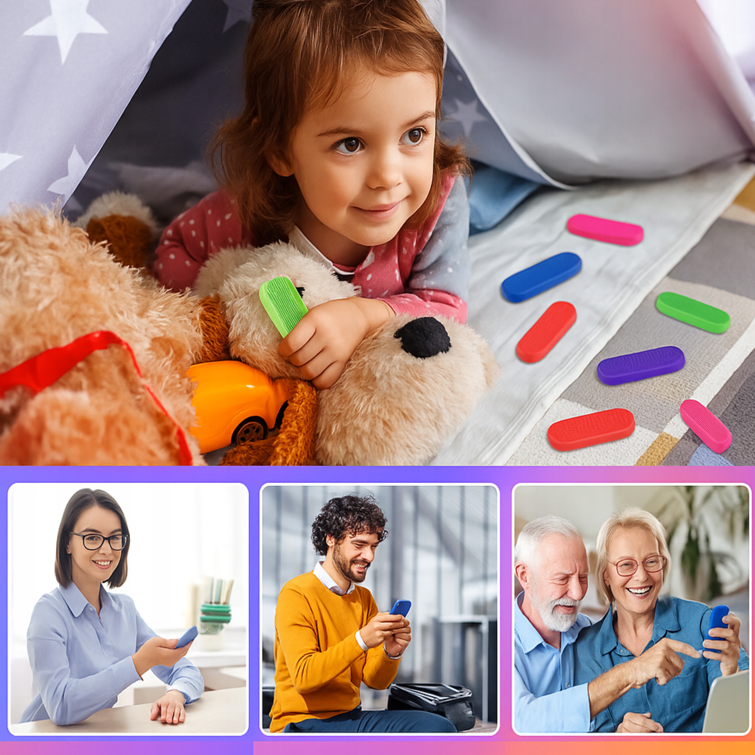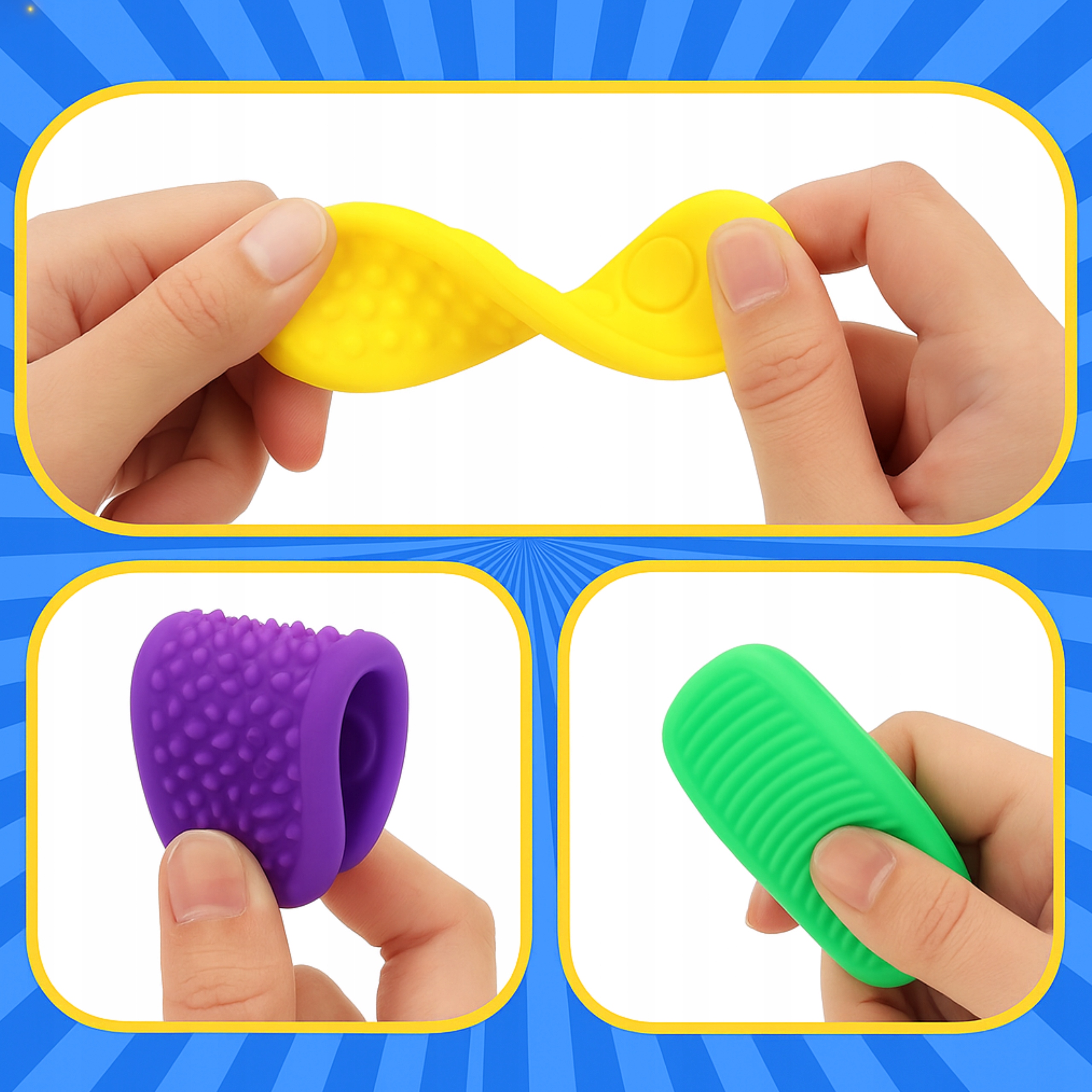 Zabawki sprawdzą się zarówno u dzieci, jak i dorosłych. Polecane są szczególnie do pracy z dziećmi z autyzmem, ADHD czy problemami z koncentracją. Wystarczy je ściskać, zginać lub pocierać palcami – to proste i skuteczne narzędzie do rozładowania stresu i napięcia.